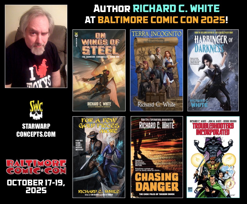 Among the creators you’ll find in Artists Alley will be author Richard C. White, the author of a growing list of StarWarp Concepts titles: the swashbuckling adventure novel Harbinger of Darkness; the fantasy-adventure story collection For a Few Gold Pieces More; the writers’ and RPG gamemasters’ aid Terra Incognito: A Guide to Building the Worlds of Your Imagination; the supernatural-superhero graphic novel Troubleshooters, Incorporated: Night Stalkings; the noir-fantasy story collection Chasing Danger: The Case Files of Theron Chase; and the pirate-adventure digital comic The Chronicles of the Sea Dragon Special.