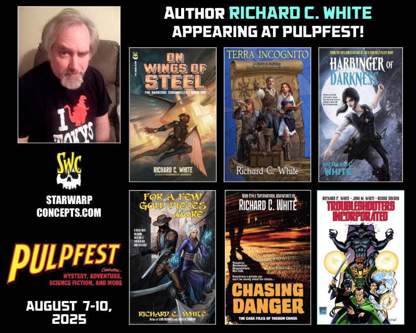 Among the attendees at this get-together will be author Richard C. White, who’ll be promoting his latest SWC release, the sci-fi steampunk novel On Wings of Steel: The Darkside Chronicles, Book 1, in which Erica Halgrim, a member of the Angels of Steel courier service, finds herself drawn into a political plot—and possibly murder—at the risk of her own life. No doubt he’ll also be promoting his noir-fantasy story collection Chasing Danger: The Case Files of Theron Chase, in which a private eye works the back streets of the city of Calasia on behalf of supernatural clients in trouble, and finds his hands full of danger, death, and femme fatales!